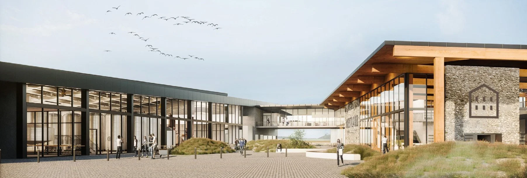 The proposal organizes visitor circulation and manufacturing operations through a strategy of separation and controlled transparency. The main entry opens to a central courtyard that provides visual access to portions of the production process while maintaining clear separation between public circulation and industrial operations. The visitor center is positioned to allow controlled engagement with the distillery workflow while maintaining operational efficiency and safety.