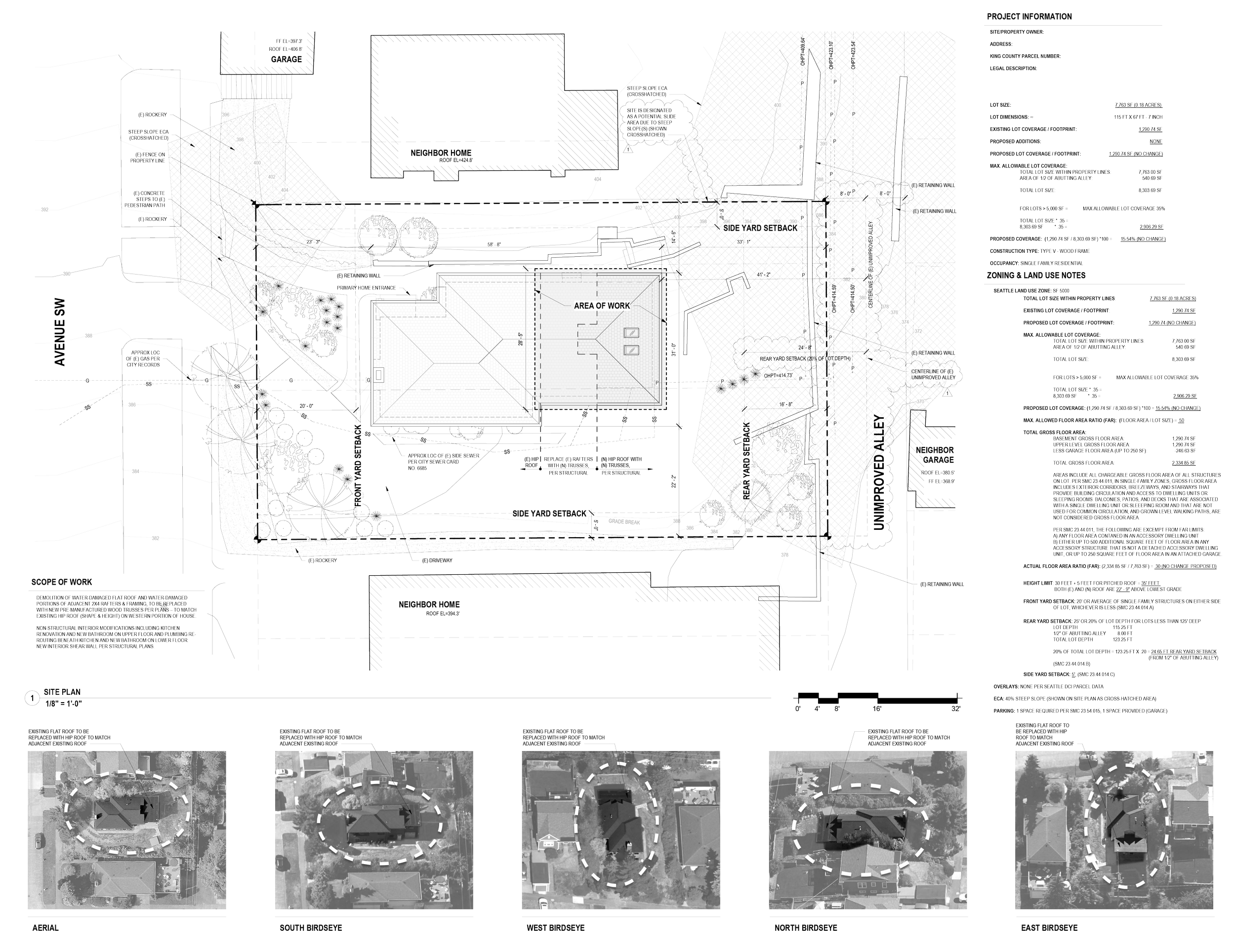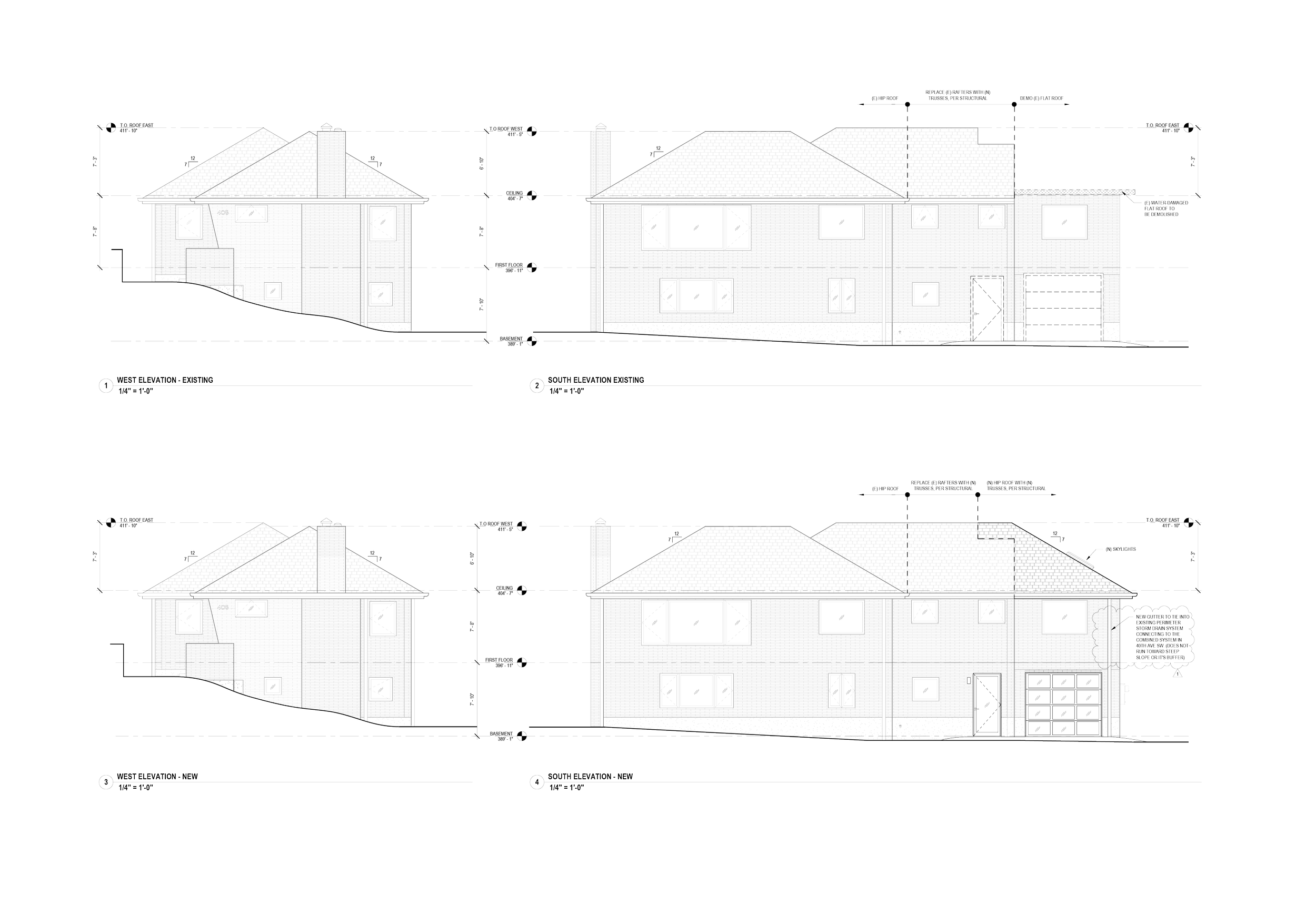 Upward Architecture completed a renovation of a single-family residence in West Seattle. The project addressed water damage to the existing flat roof and compromised framing, replacing the damaged roof structure with new pre-manufactured wood trusses that match the existing hip roof on the western portion of the house.