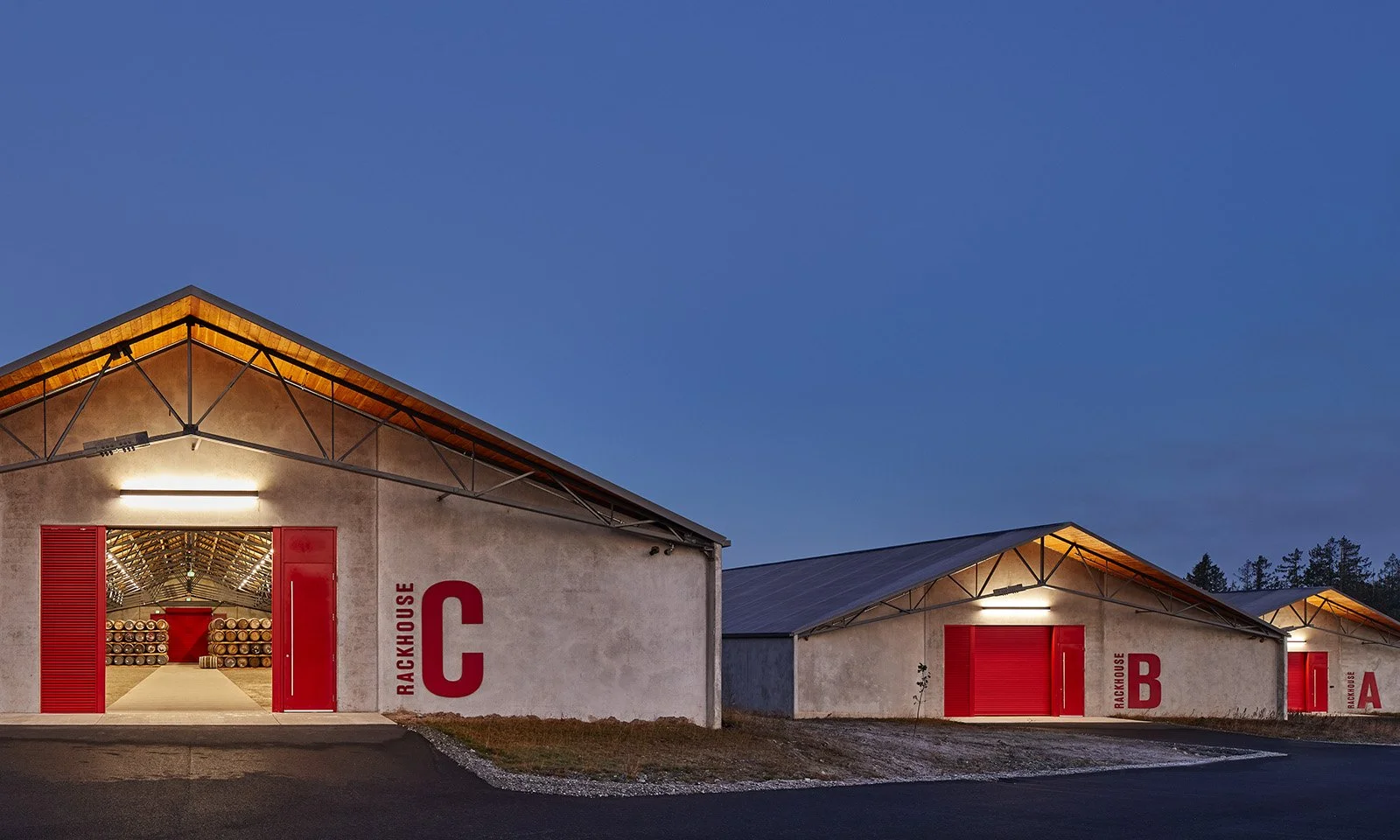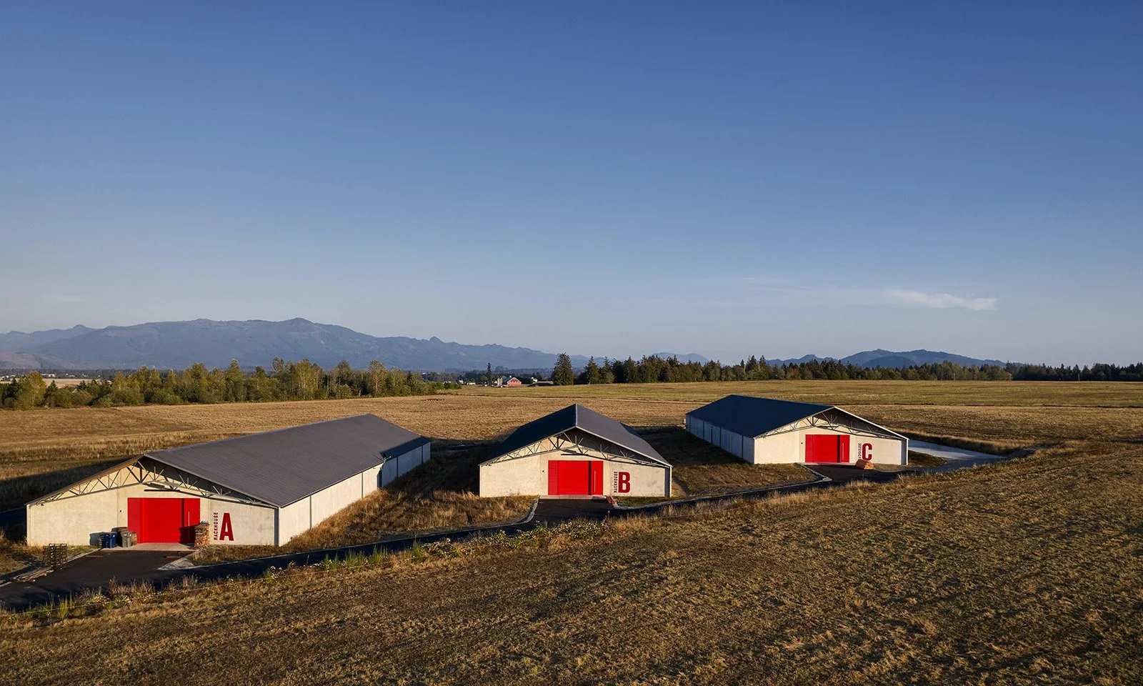 Westland’s barrel aging rackhouses support large-scale whiskey barrel aging in the Skagit Valley. Each building stores more than 4,000 barrels and is unconditioned and passively ventilated to allow climate conditions to influence the aging process. Tilt-up concrete walls provide thermal mass that moderates daily temperature swings, following precedents from traditional Scottish rackhouses. Covered entries at both ends protect workers during barrel operations while defining threshold conditions. Stormwater is managed through Underground Injection Control (UIC) wells, engineered by Jacobson Engineering and Associated Earth Sciences, returning runoff safely to the aquifer while preserving Skagit Valley topsoils.